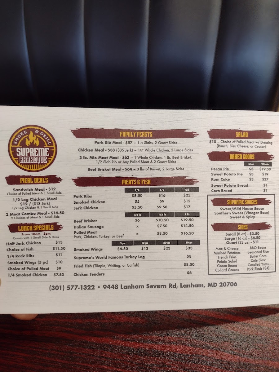 Welcome to Supreme Barbeque aunteaboba, where smoky flavors meet culinary excellence. Nestled at 9448 Lanham Severn Rd, this establishment has quickly garnered a reputation for its mouthwatering barbeque and delightful drinks. Customers rave about the meticulously smoked and jerk chicken—each bite showcases rich flavors that evoke rave reviews from gatherings and celebrations.
